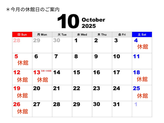 10月は上記カレンダーの日程で、休館とさせていただきます。