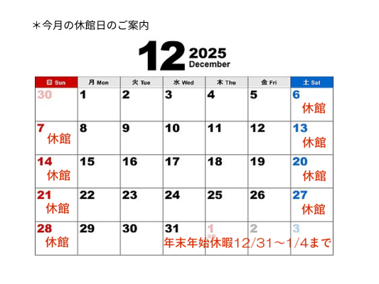 12月は上記カレンダーの日程で、休館とさせていただきます。